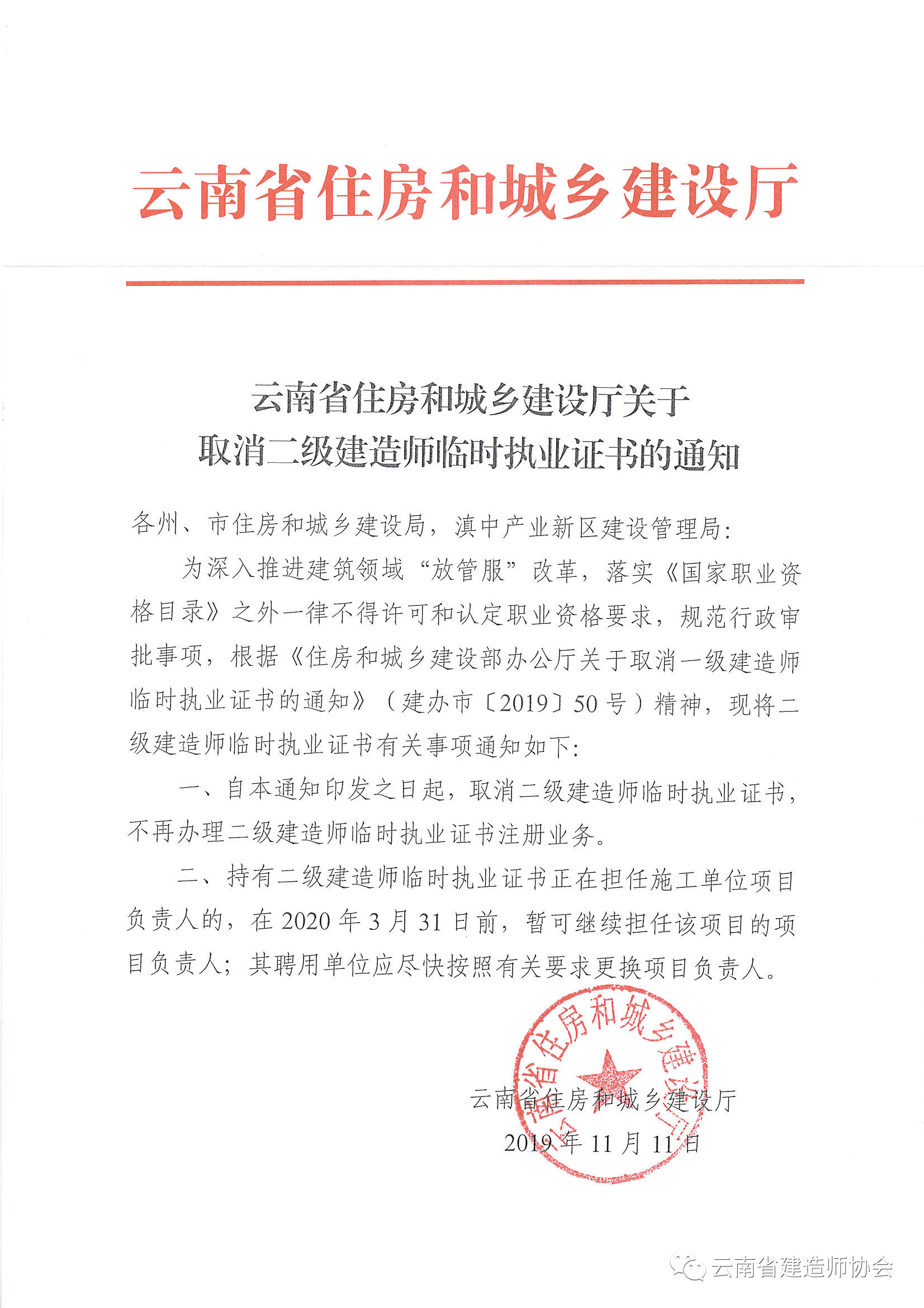 云南省住房和城乡建设厅关于取消二级建造师临时执业证书的通知