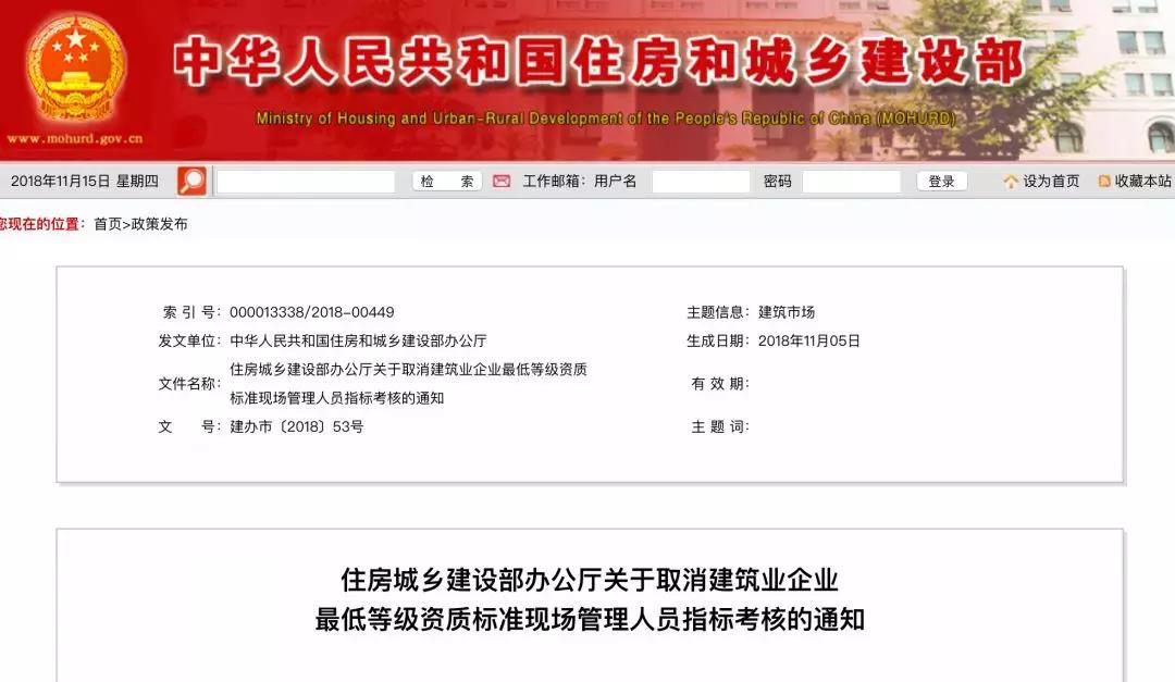 住房城乡建设部办公厅关于取消建筑业企业最低等级资质标准现场管理人员指标考核的通知建办市〔2018〕53号